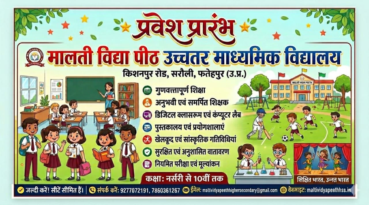 MALTI VIDYA PEETH HIGHER SECONDARY SCHOOL in Khaga, Fatehpur, is a distinguished institution committed to holistic education. It provides a vibrant learning environment that nurtures academic excellence, moral values, and creativity. With a modern curriculum, state-of-the-art facilities, and a dedicated faculty, the school empowers students to become confident, responsible, and lifelong learners. It stands as a beacon of quality education, shaping future leaders for a dynamic world.